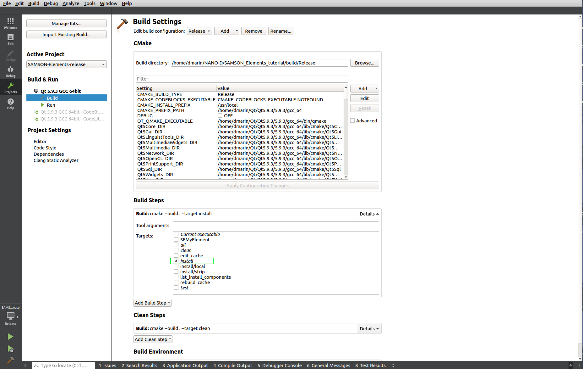 Now when you build the install target ( Ctrl + B ) and run ( Ctrl + R ) SAMSON will be launched from QtCreator.