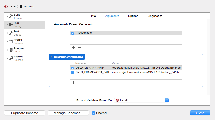 We need to setup some environment variables to let SAMSON search for frameworks or libraries to the corect location. In the Arguments tab add the following environment variables :