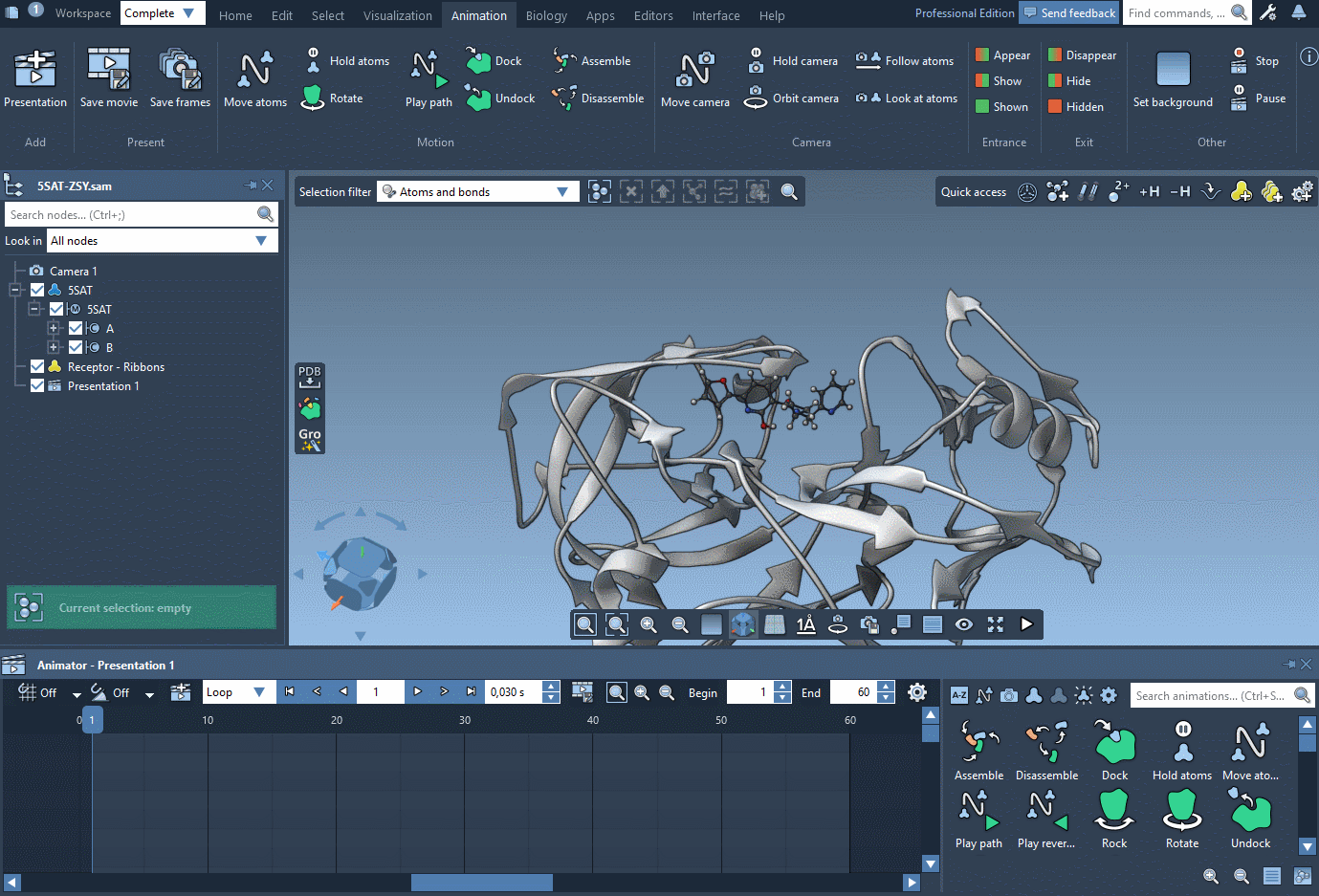 Note: In the movie we use the Animation menu which is no longer present in SAMSON - you can access all animations via the Animation panel and all presentation actions via the Animator's controls.