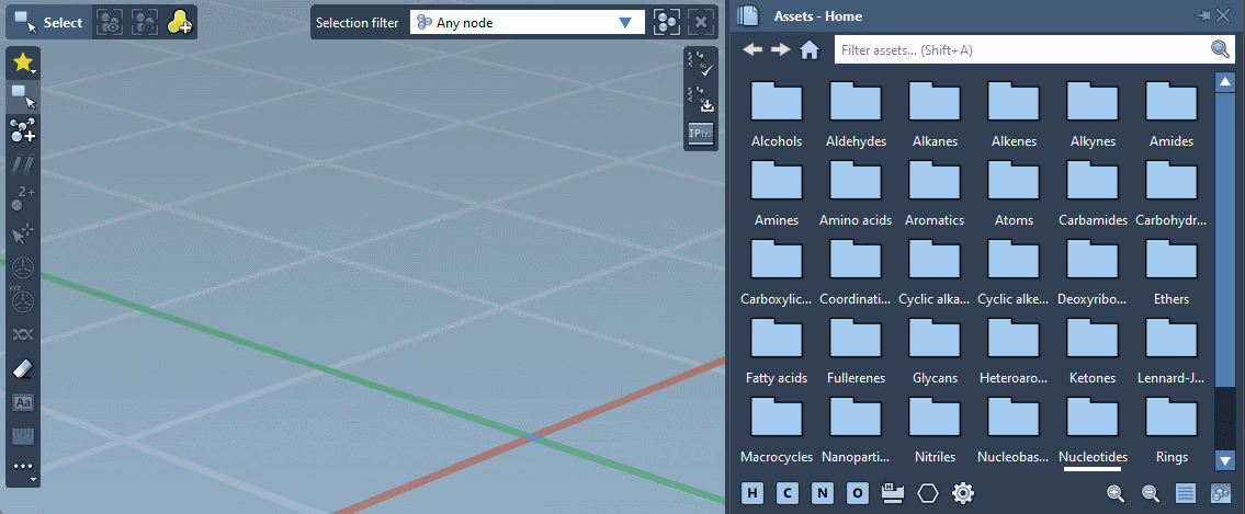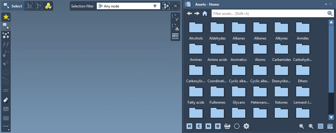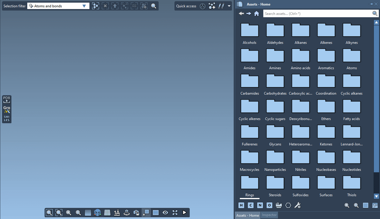 Assets can be anything: atoms, functional groups, rings, fragments, radicals, whole molecules, proteins, nanoparticles, 2D materials, etc. You can assemble them in the Document to rapidly set up complex models for analysis and simulation.