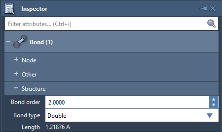 You can also modify the bond order and bond type by selecting the bond and going to the Inspector ( Ctrl / Cmd⌘ + 2 , Interface menu > Inspector). But note that in this case, hydrogens will not be adjusted automatically.