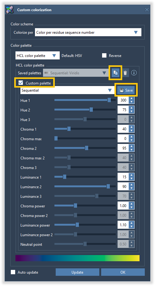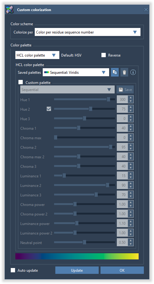 You can also create your own color palettes in the HCL color space by copying the parameters from the existing one, checking the "Custom palette" option, and modifying it. You can save your color palette as a new one for later use - it will be stored in your local SAMSON configurations. You can also revert left and right arms of color palettes in the color palette or color scheme dialogs.