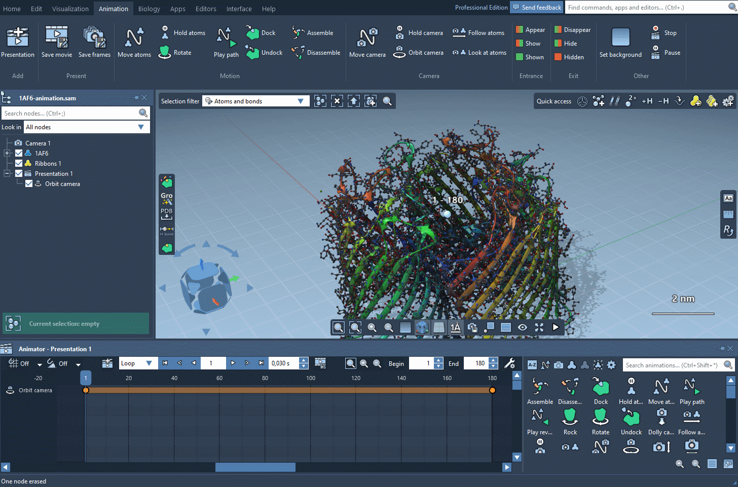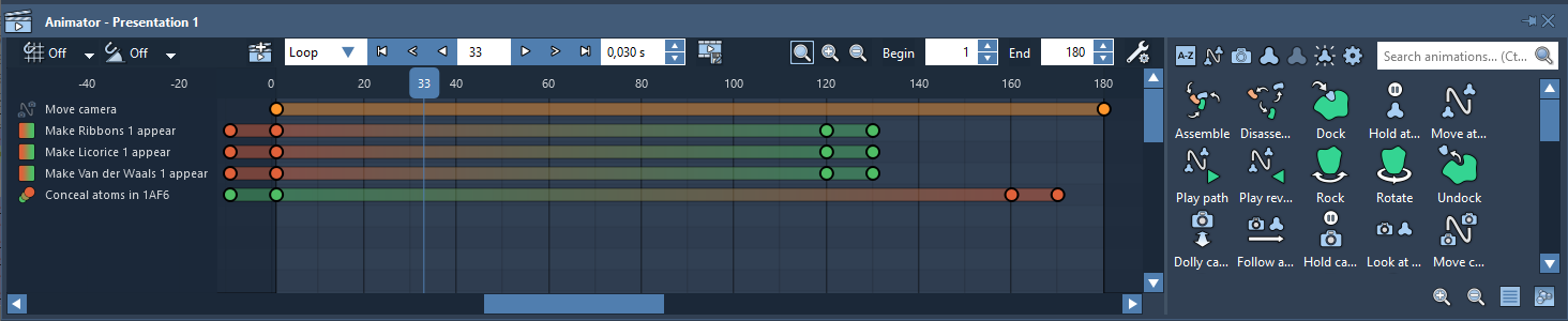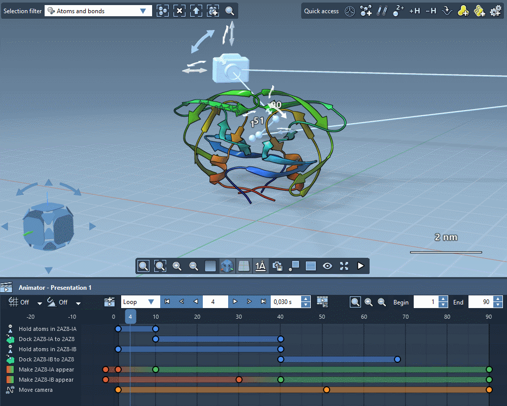 In a moment, it will download this shared document into your SAMSON. Double-click on the Presentation node in the document view and it will open the Animator. Now, click Space to start and stop the presentation or use the animator's controls on the top-center of the animator.