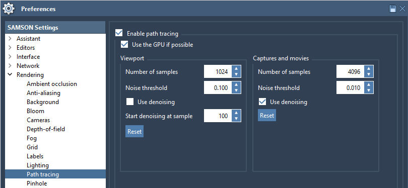 The path tracing settings may be changed in the Rendering > Path tracing section of the Preferences panel: