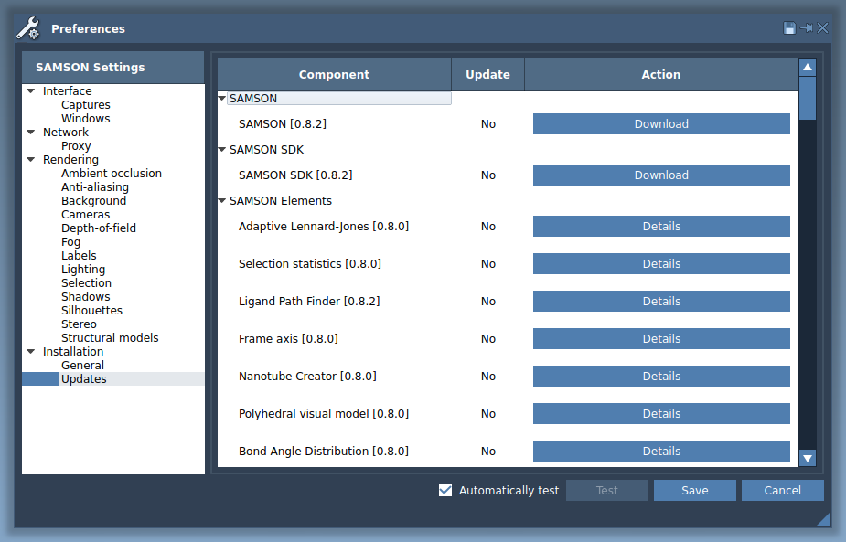 This page shows the availability of updates for SAMSON, SAMSON SDK and SAMSON Extensions, the current versions installed, and a possibility to check the detailed information on the installed SAMSON Extension by clicking the "Details" button which should open a web-page associated with this SAMSON Extension.